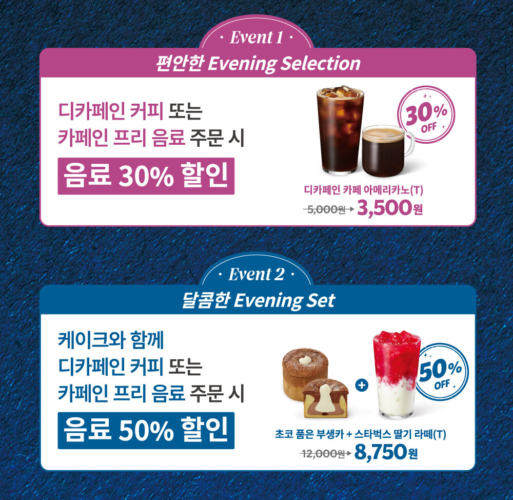 퇴근길, 혹은 학원 마치고 집에 가기 전! 조용한 스타벅스 매장에서 커피 한 잔과 디저트를 50% 할인된 가격에 즐길 수 있다면? 지금이 바로 그 기회예요. 혼자만의 여유로운 저녁 시간, 굿이브닝 이벤트로 더욱 달콤하게 만들어보세요. 😊