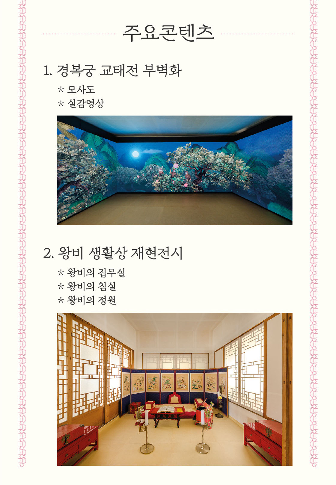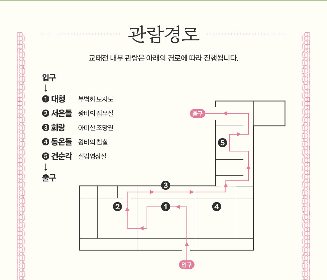 - 입구 → 대청 : 부벽화 모사도 → 서온돌 : 왕비의 집무실 → 회랑 : 아미산 조망권 → 동온돌 : 왕비의 침실 → 건순각 : 실감영상실 → 출구