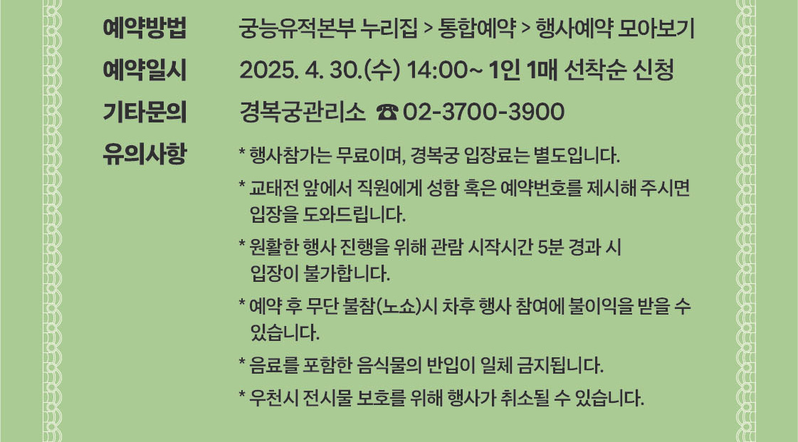 - 예약 방법 : 궁능유적본부 누리집 → 통합예약 → 행사 예약 모아 보기