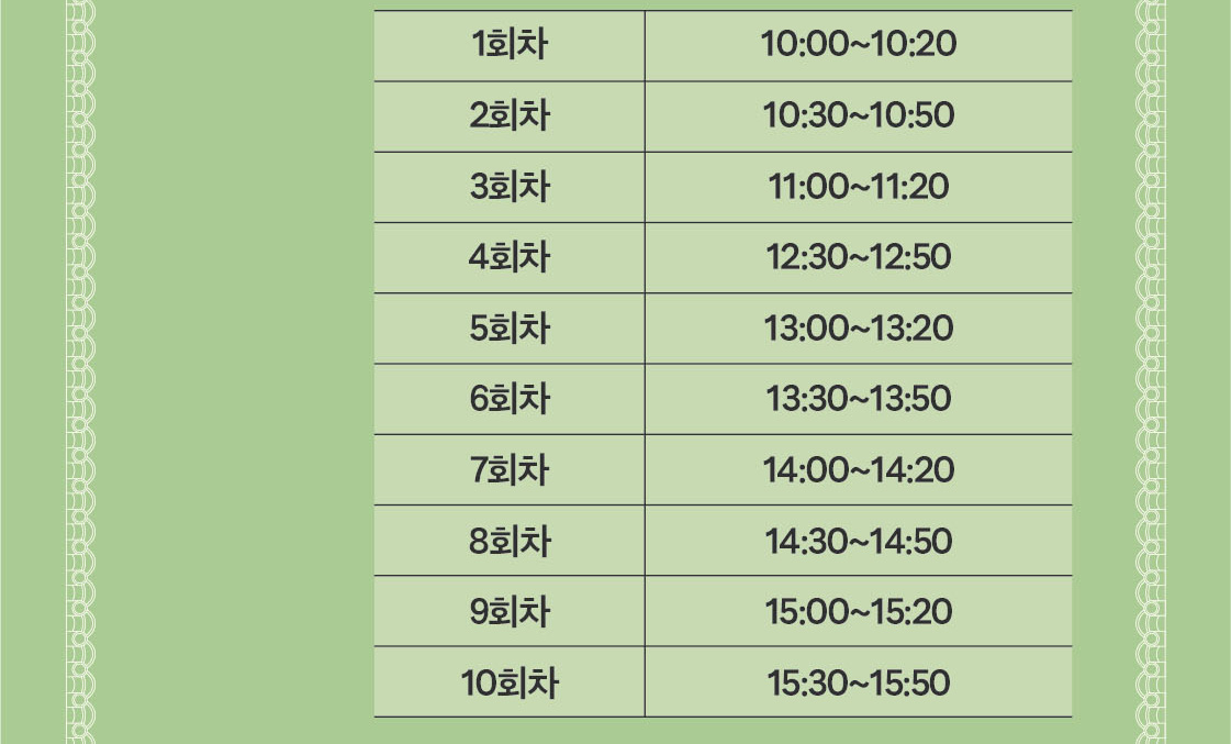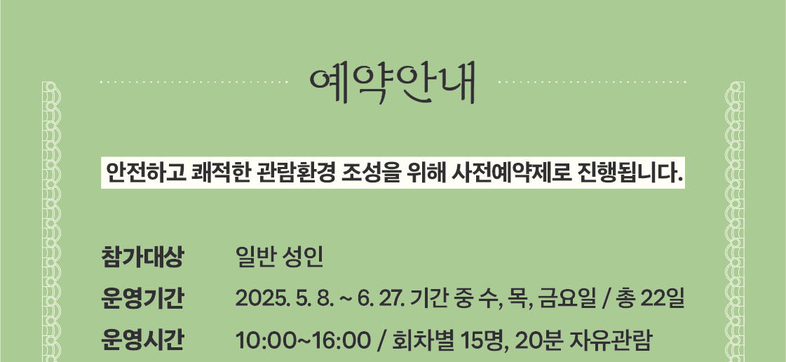 - 회차 : 1일 10회 차 / 회차당 15명 / 20분 자유관람